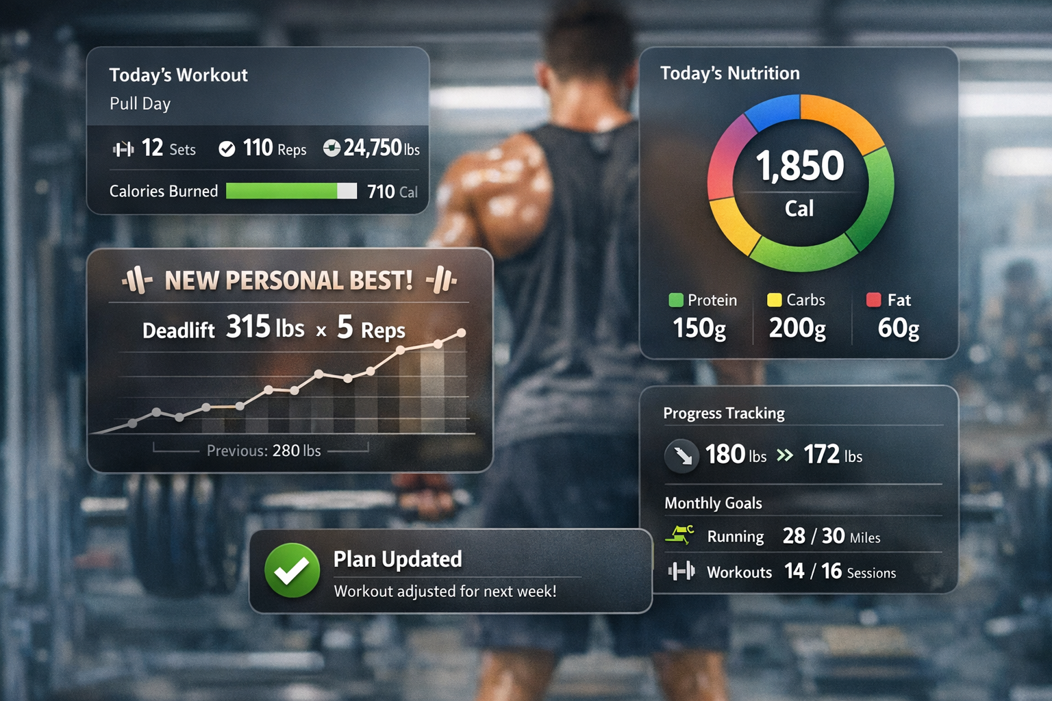 We track every rep, every meal, every milestone — and adjust your plan in real time so you never plateau.